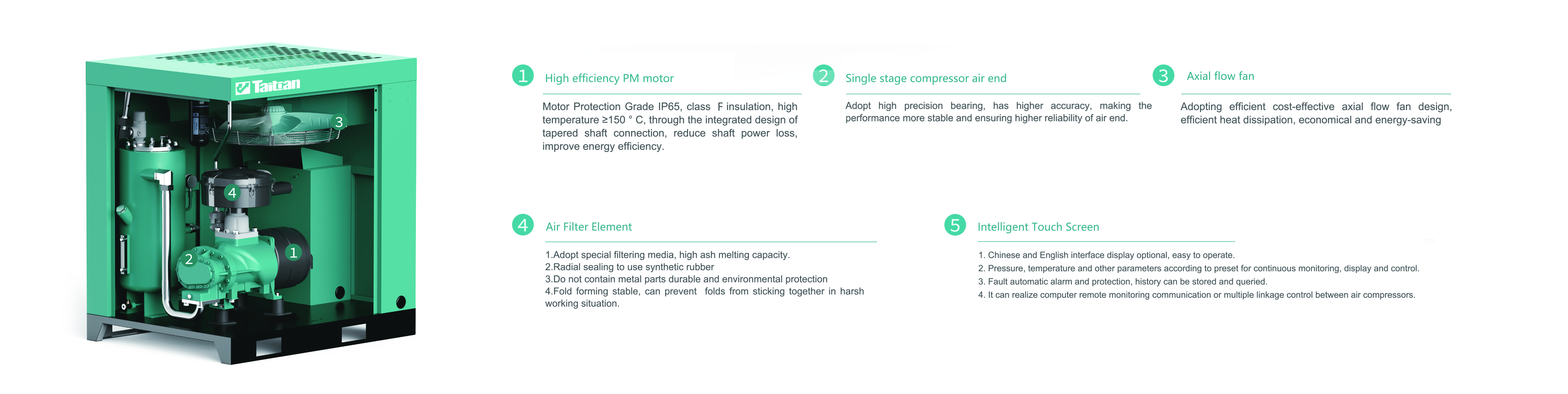 3.Adopt air cooling compact design, reduce shaft power loss,improving energy efficiency;